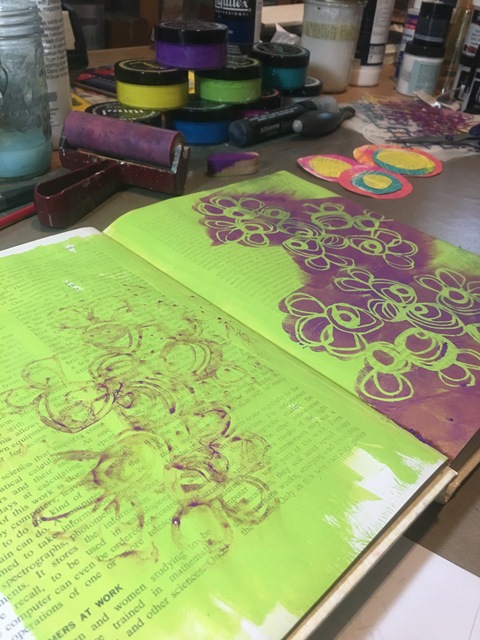 Not wanting to waste the excess pink paint I had on my mat, I laid the stencil down on it and then put the book on top of the mat hoping to get a good amount of pressure and hopefully coverage!